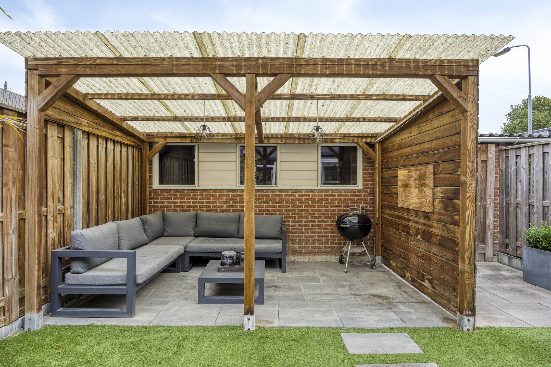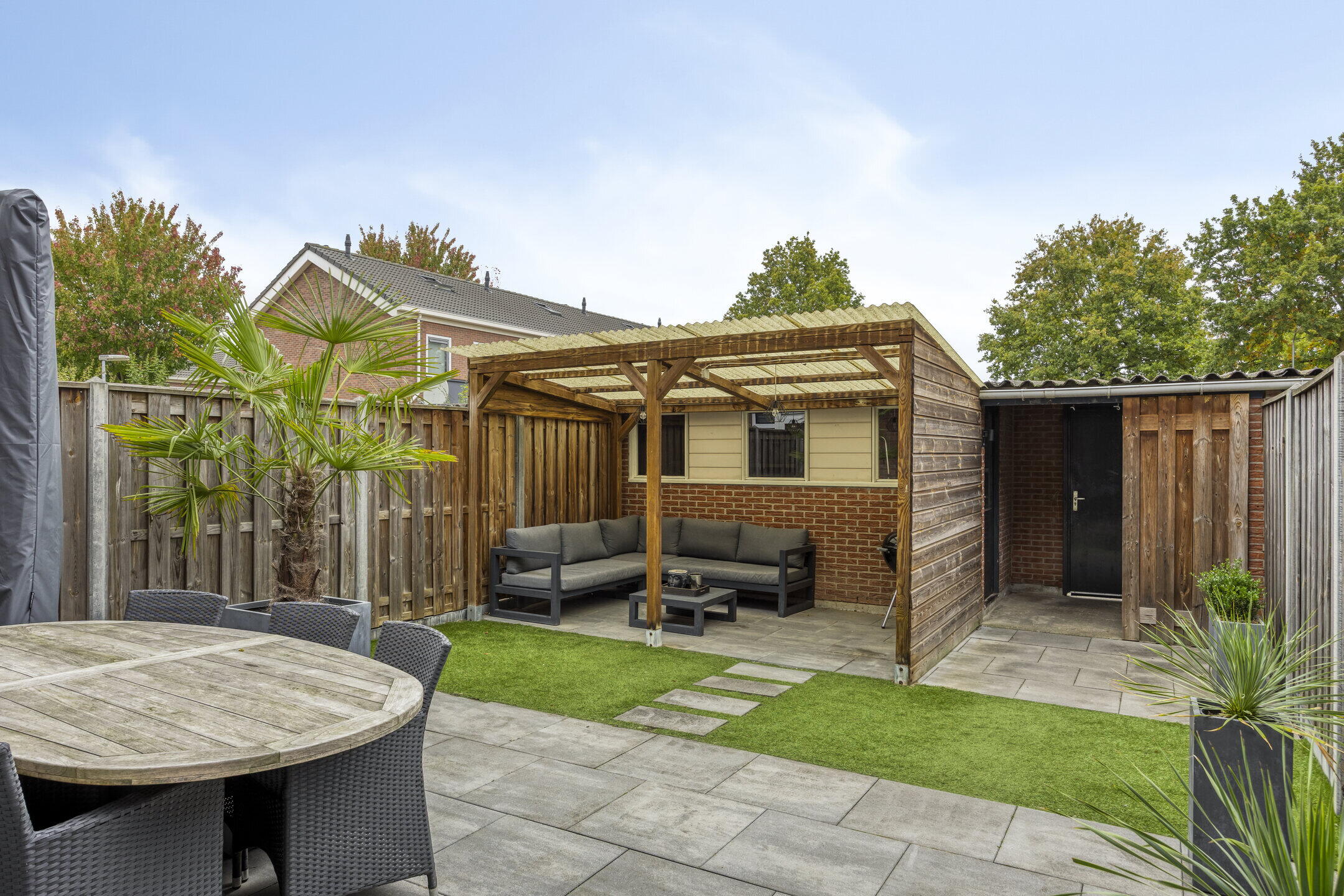 De achtertuin is verzorgd aangelegd met een gazon, een stenen berging met golfplaten dak, een overkapping met extra bergruimte en een gezellige veranda.